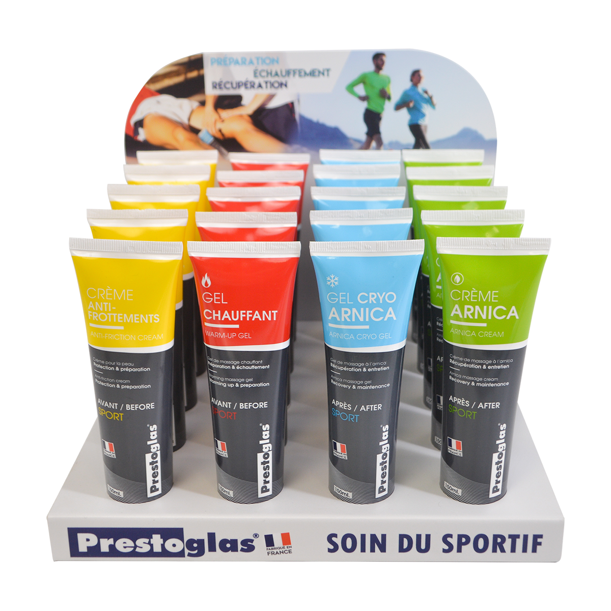 Set van 20 massagegels en -crèmes: 5 verwarmende gels 066127, 5 cryo-arnica gels 066128, 5 anti-wrijvingscrèmes 066126 en 5 arnica crèmes 066100 + GRATIS display.
